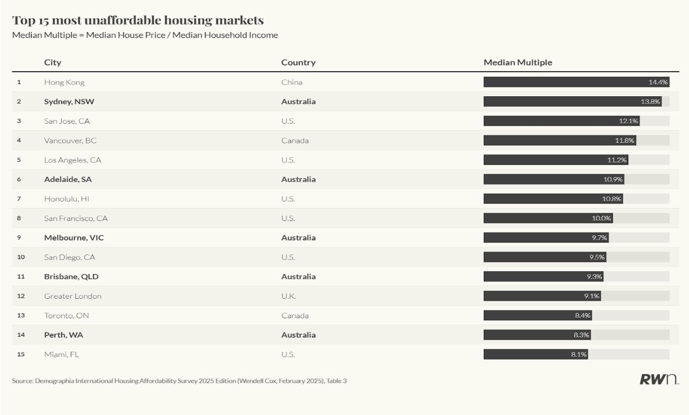 In global terms, all five of Australia’s major cities fall into the report’s highest category of unaffordability. The latest report continues to rank Sydney as the world’s second least affordable housing market, behind only Hong Kong. Sydney’s median house price is now 13.8 times the median household income – what Demographia calls “impossibly unaffordable”. Adelaide’s multiple has climbed to 10.9, pushing it past Melbourne (9.7) and Brisbane (9.3).
